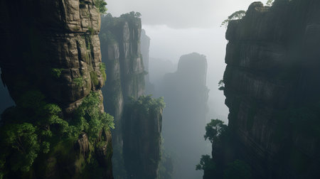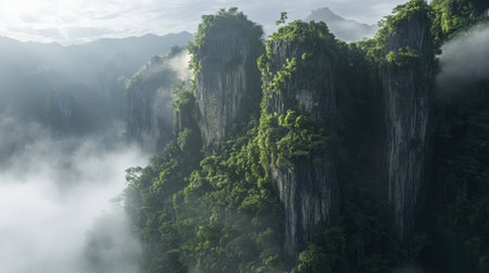 Experience the breathtaking beauty of towering mountain peaks enveloped in lush greenery and mystical fog, creating a serene natural landscape perfect for exploration.