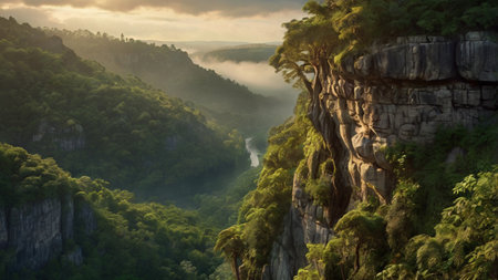 Towering cliffs draped in vibrant vegetation rise proudly against the sky. The sunlight filters gently through the trees, creating a peaceful atmosphere in this natural wonderland.