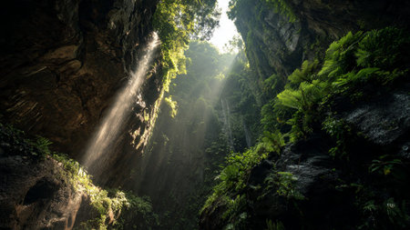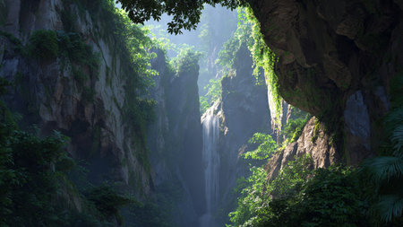 Misty sunbeams illuminate a cave entrance opening to a dense tropical forest