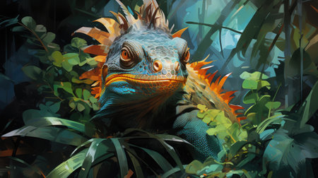 Iguana in the tropical rainforest. Lizard in the jungle. Generative AI illustration