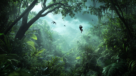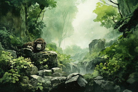 A large gorilla is running through a lush jungle. The scene is vibrant and full of life, with the green foliage and the animal's movements creating a sense of energy and excitement with Generative AI