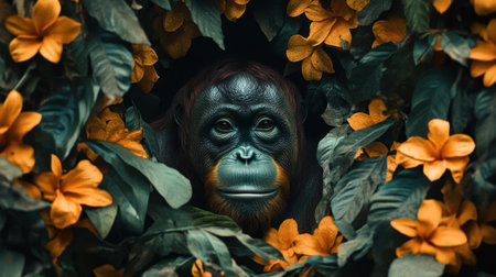 This captivating image features a majestic orangutan nestled among vibrant flowers and leaves, showcasing the beauty of wildlife in its natural habitat.