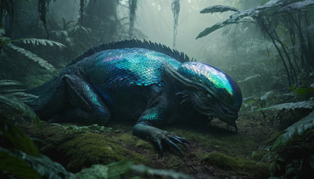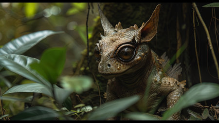Spooky lizard, green scales, tropical forest, horned gecko, danger generated by artificial intelligence
