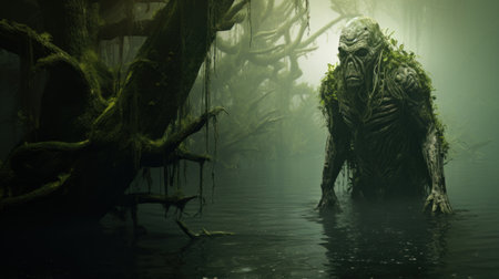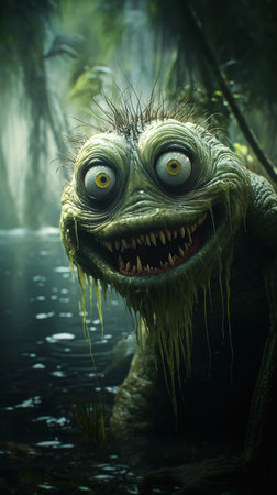 Swamp monster with sharp teeth and glowing eyes emerging from dark water in mysterious forest