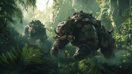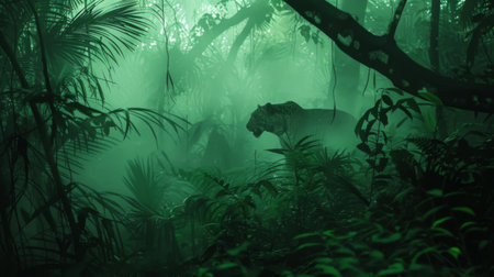 A magnificent gorilla stands amid a vibrant jungle setting, showcasing its strength and beauty. The dense foliage creates a serene atmosphere, highlighting the wildlife.