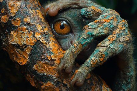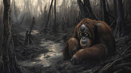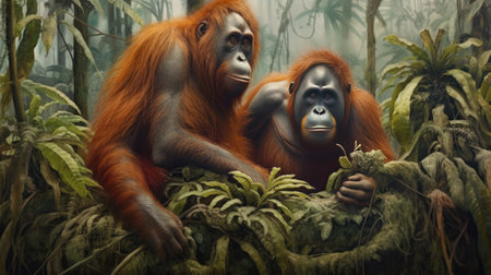 In the verdant embrace of Sumatra's rainforest, an endangered Bornean orangutan clings to a tree, its soulful eyes reflecting centuries of resilience. Its shaggy coat, a testament to its arboreal existence, blends seamlessly with the lush foliage. As the sun filters through the canopy, casting ethereal shadows upon the ancient forest, the orangutan surveys its dwindling habitat with a profound gaze, a silent plea for conservation amidst the encroaching threats of deforestation and habitat loss.