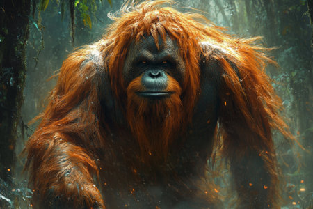 Powerful orangutan in rainforest, jungle background, wildlife documentary