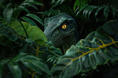 A detailed model of a spinosaurus dinosaur is nestled amidst a lush, green backdrop, appearing to traverse through dense foliage.