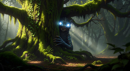 A mysterious, dragon-like fantasy creature with glowing blue eyes peeks from behind a large, moss-covered tree in an enchanted forest. Sunbeams pierce the canopy, creating a magical and slightly menacing atmosphere.