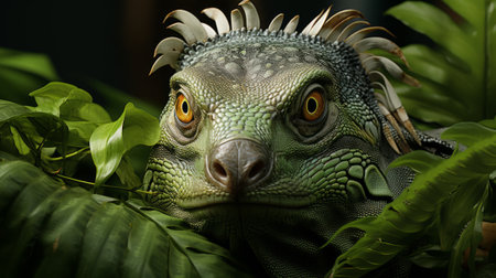 Amidst the vibrant green foliage, a majestic iguana basks in the warmth of the sun, its chameleon-like skin blending perfectly with the surrounding leaves