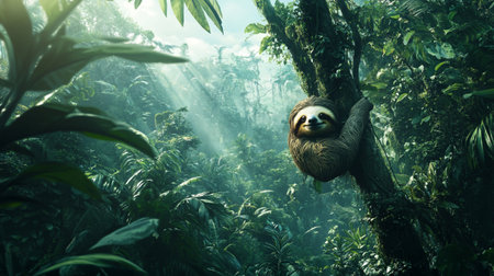 A sloth peeks from behind lush green leaves in a tropical rainforest. Wildlife Animals.