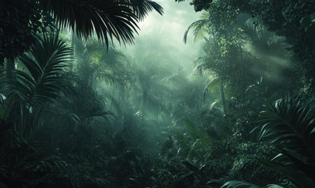 Deep tropical forest in darkness, creating a mysterious and dense atmosphere.