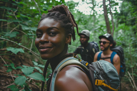 A female hiker with a backpack ventures through a lush green forest, symbolizing adventure, exploration, and connection with nature