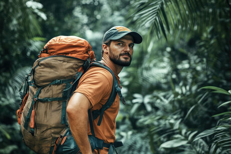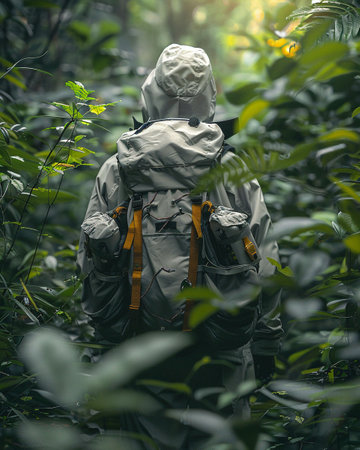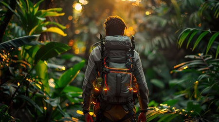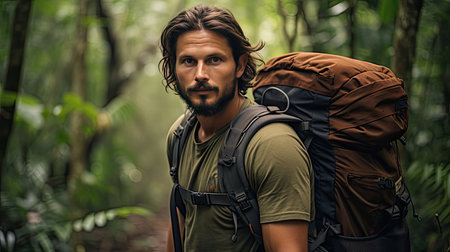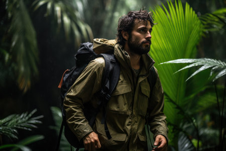 outdoorsman trekking through jungle, surrounded by lush greenery, created with generative ai