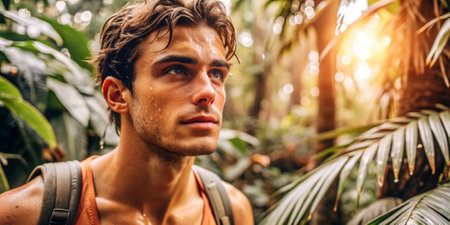 A young man traveling through a jungle forest in the summer, sweat glistening on his forehead.