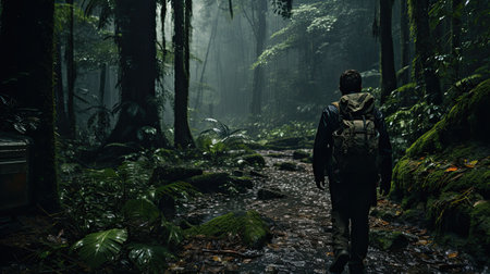 A hiker's silhouette moves through dense jungle trails, immersed in the vibrant, lush environment of the rainforest.