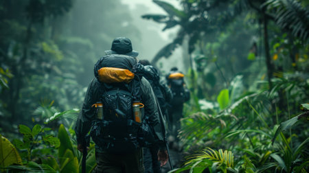 A team trekking through a jungle, relying on each other's strengths to navigate