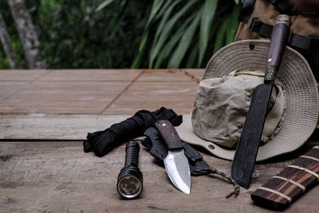 A knife with equipment for survival in the forest on an old wooden floor