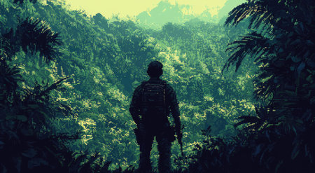 8-bit pixel art depicting an armed soldier standing in the foreground, facing away from the viewer, with a dense jungle of tall trees and foliage in the background. --ar 78:43 --v 6.1 Job ID: cf1e162e-f77c-4d4a-bdad-9dd27988dc9f