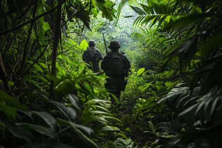 Two Soldiers Walking Through the Jungle, Special forces soldiers navigating their way through a dense jungle in a stealth mission, AI Generated