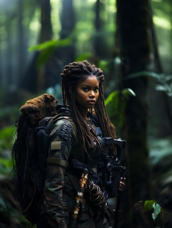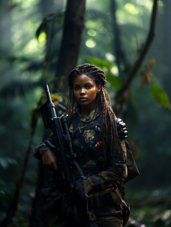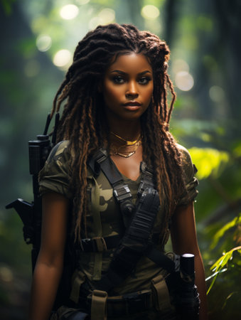 Dark-skinned young girl in full length military uniform with weapon in hand in the jungle