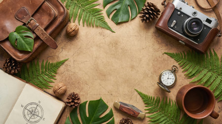 A captivating overhead shot of travel essentials, including a vintage camera, leather bag, compass, and natural elements like leaves and pinecones, arranged on a textured surface.