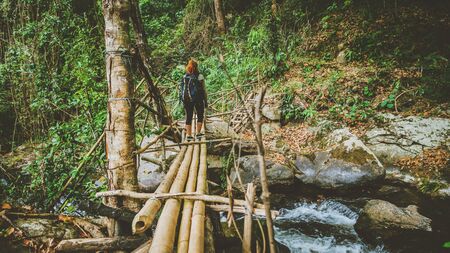 woman asia travelers travel nature Forests, mountains, waterfalls. Asian woman travel nature. Travel relax.