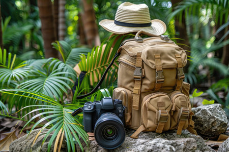 Backpack Camera and Hat Amidst Lush Greenery