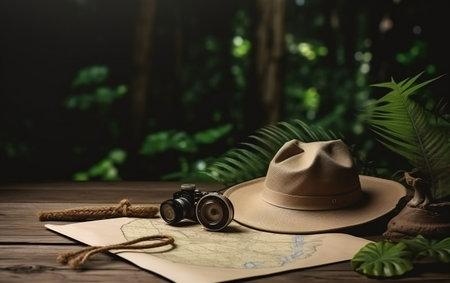 A flat lay of vintage adventure and exploration equipment including binoculars, rope, flask, hat, camera, compass, and journal.