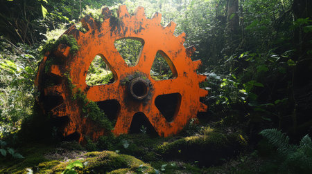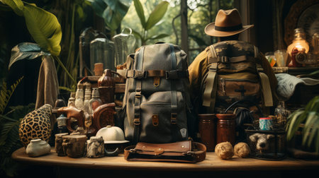 military backpack in the middle of jungle, surrounded by greenery and wildlife, created with generative ai
