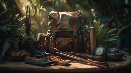 Hunting equipment in the forest. Backpack, binoculars, knife, compass, binoculars.generative ai