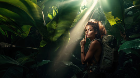 In a vibrant jungle, a woman with a backpack signals for silence, her mysterious expression illuminated by sunlight filtering through the dense foliage.