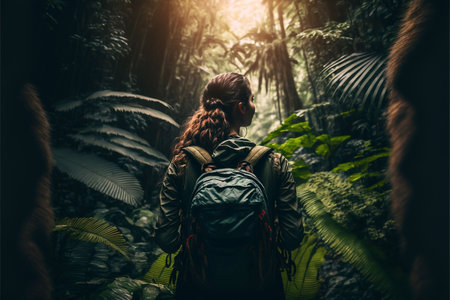 An AI generated back view of woman walking through a lush forest