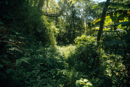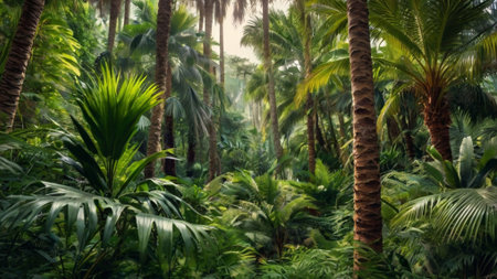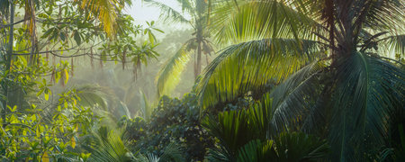 breathtaking dense tropical forest with rich flora lush bushes and high trees against white sky and bright morning sunlight
