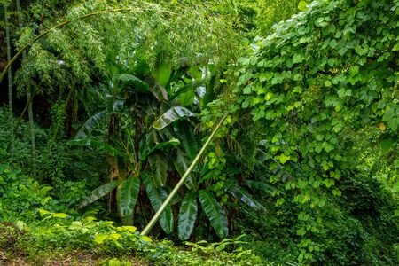 Summer landscape of subtropical forest after rain - palm tree, bamboo and lush foliage.