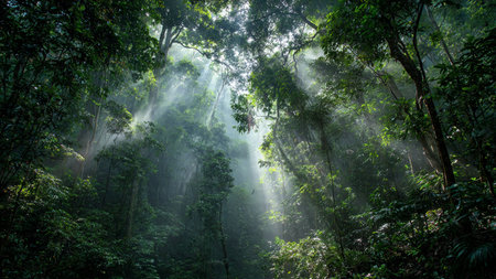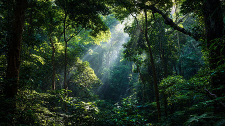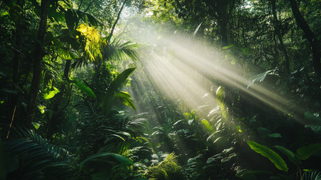 Sun rays shining through the canopy of tropical trees in the rainforest