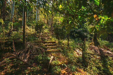 Goa, India. View Of Road Lane Path Way Old Steps In Jungle Surrounded By Tropical Green Vegetation, Trees And Bushes In Sunny Day.