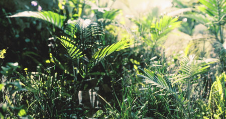 Vibrant green plants thrive under soft sunlight in a peaceful outdoor environment. Various types of foliage create a rich and calming atmosphere in a natural landscape.
