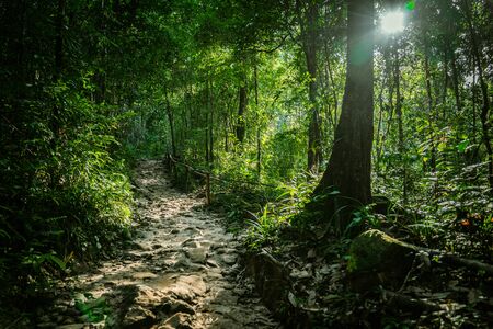 Morning sunlight in the rain forest. Beautiful nature scene with sunbeams.