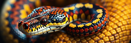 A detailed close-up of a snake with vibrant yellow and black scales, set against a dark background. the striking contrast highlights the intricate patterns and textures, perfect for wildlife enthusiasts and creative design uses.