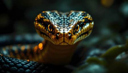 A captivating close-up of a snake, its scales shimmering with gold and black. The snake's intense gaze commands attention.
