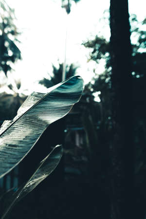 closeup shot of wet palm leaves or leafs in the rainy day on the evening