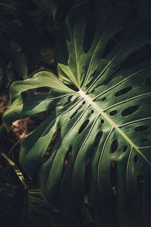 Close-up of Monstera deliciosa leaf in garden. Swiss cheese plant in Tropical forest at botanical. Moody tone.