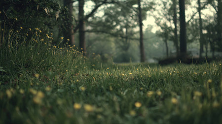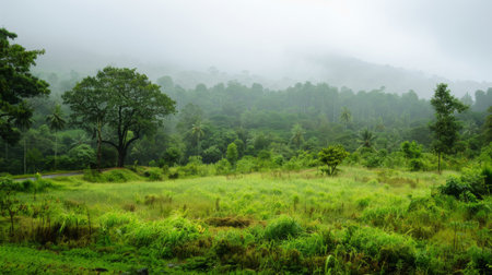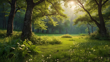 Captivating view of a misty forest landscape featuring lush greenery, tall trees, and a tranquil meadow, ideal for nature enthusiasts seeking peace and beauty.