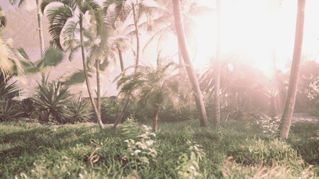 Lush palm trees sway gently as soft sunlight illuminates a tranquil garden. The greenery glows with warmth and offers a peaceful escape in natures beauty.