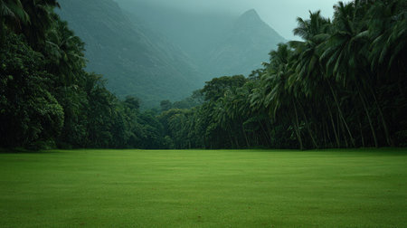 This image features a serene landscape with a vast green field framed by palm trees and majestic mountains under an overcast sky, evoking tranquility and natural beauty.