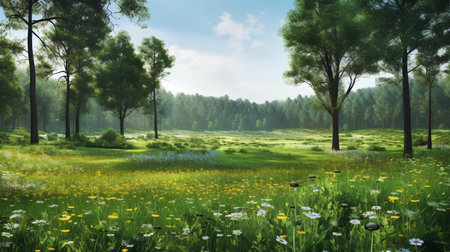 A beautiful landscape of a lush meadow with colorful flora and fauna