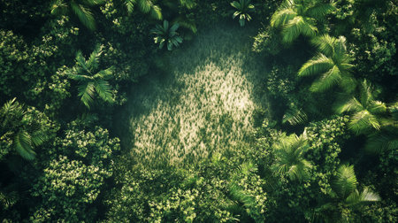 An overhead view reveals a dense arrangement of various green leaves, creating a natural frame. The image presents a lush texture with variations in shades of green. It evokes a natural environment, potentially suitable for design, background, and other illustrative purposes, offering visual richness.