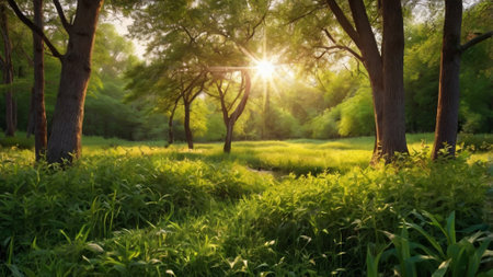 A serene scene of sunlight filtering through the trees in the lush green jungle and illuminating the verdant landscape. Generative AI