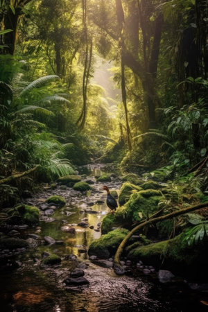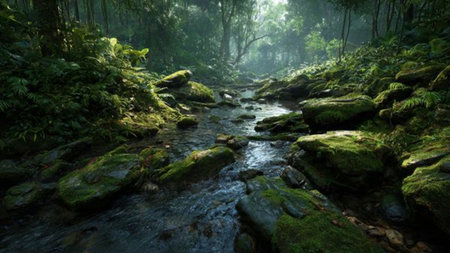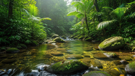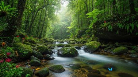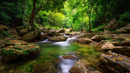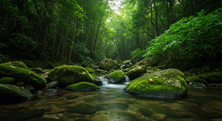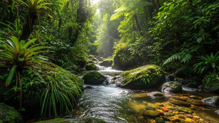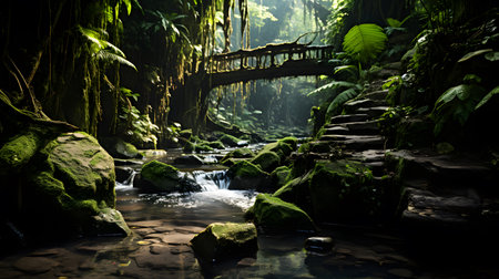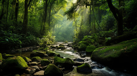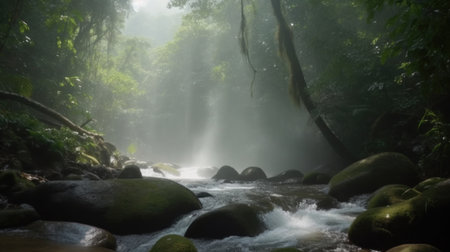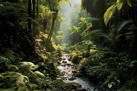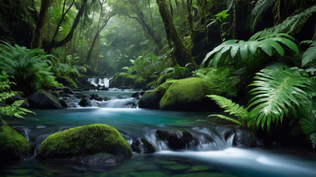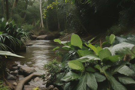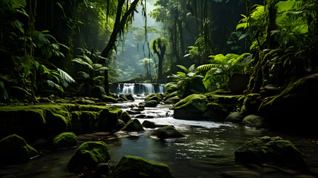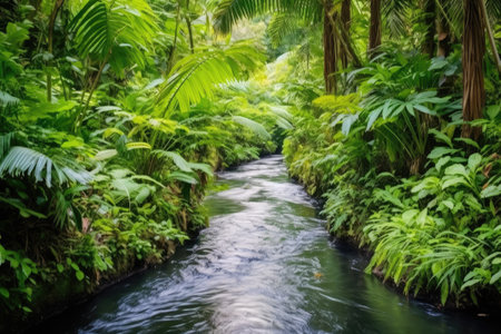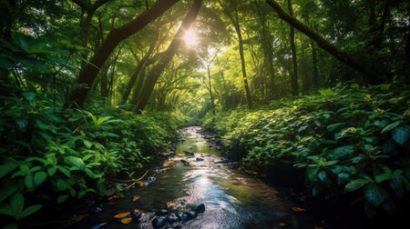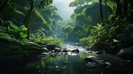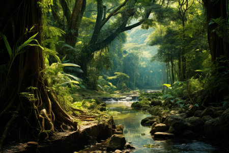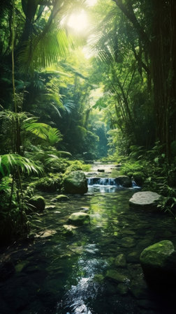 Tropical rainforest with a stream flowing through the jungle with AI-Generated Images